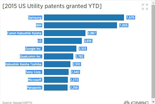 3、据美国财经 新闻 网站CNBC报道,距离2015年结束还有半个月的时间,但是一些专业机构已经在进行专利数量排行榜的研究。据称,在年度专利获取数量上,IBM连续22年位居美国第一,但是今年三星将会超过IBM,夺得宝座。三星在过去十多年时间里一直是第二名。