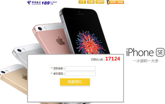 中国电信预约购买iPhoneSE入口:http://www.189.cn/iphoneSE/。