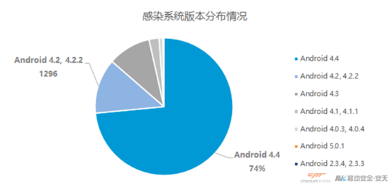 感染Client病毒最多的设备系统版本为安卓4.4,占总感染量的70%以上,部分5.0系统也受到影响,但占比不到1%。