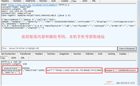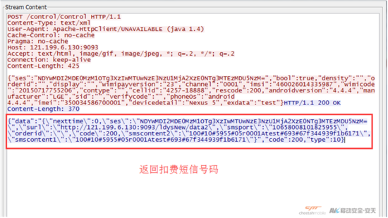 第三次访问:http://121.199.6.130:9093/control/Control(此服务器返回SP号码以及扣费短信内容信息)。