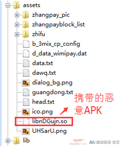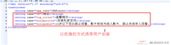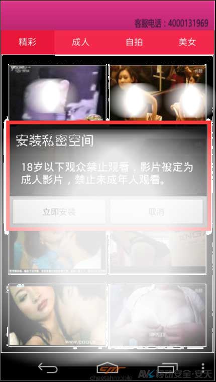 该病毒assets文件夹中包含另一个恶意软件,在用户安装Client病毒后弹出带有相关提示的确认安装界面,以色 情的方式诱导用户安装该自带恶意应用程序。