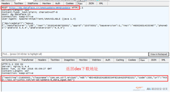 从服务器(http://dg.ogengine.com/wmserver/WMUpdate)获取dex下载地址: