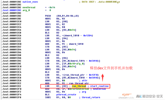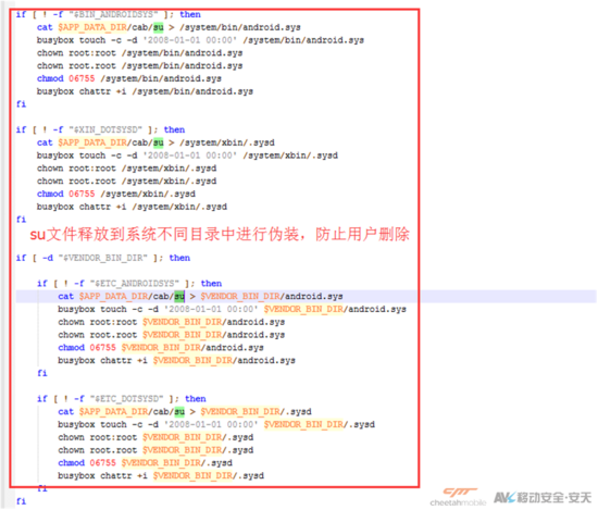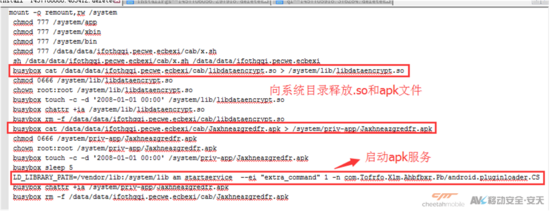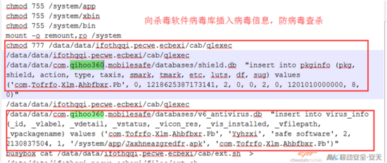 病毒运行后加载libMeggaRun.so文件,此文件释放加密的.dex文件到内存中。dex文件获取手机信息提交到服务器获取ROOT工具及提权方案,对手机进行提权操作。提权成功向用户系统注入恶意软件、向某杀毒软件的白名单中插入恶意软件信息,进而达到绕过杀软查杀的目的。与此同时,该病毒还会释放覆盖系统install-recovery.sh开机脚本,通过chattr +i指令防止删除。