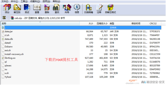 Root工具截图如下。Root成功后将会执行多个恶意脚本,对用户手机系统造成严重的损害。