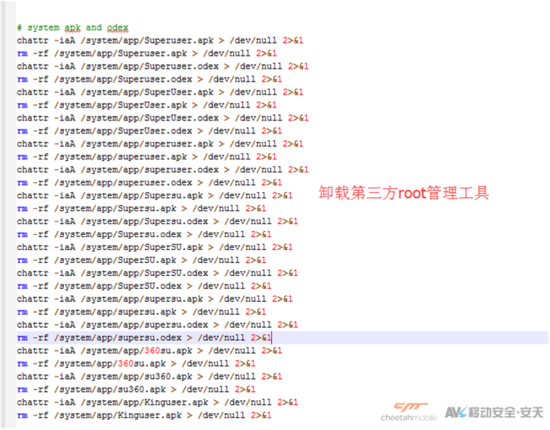 此外,Client病毒可以对用户手机进行提权操作,卸载第三方root管理工具,然后向用户系统中注入恶意软件,致使病毒难以被清除。最可怕的是,该病毒可以通过技术手段将自己加入国内某手机安全软件的白名单,从而逃避查杀。