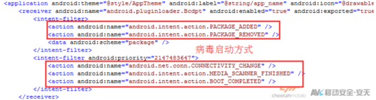 病毒启动后,读取原始应用assets里面的data.dat文件,在native方法里面的获取data.dat病毒jar包,然后访问数据库中的下载地址私自下并静默安装其他应用,给用户造成大量的流量消耗。Client病毒作者通过该恶意手段进行应用推广,以获得持续的经济收入。 病毒通过监 听系统广播启动: