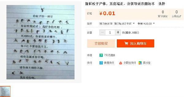 3、蚊子尸体:新鲜蚊子尸体,五官端正,送领导和送亲朋的不二选择,小编在想万能的淘宝会不会有人的尸体出售?