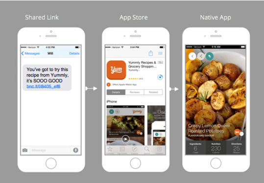 现在,我们已经了解问题所在,来看看现有的几种解决方案吧。“App linking” 可能听起来并不陌生,其实每次你在别的 App 上点击 YouTube 的链接,YouTube 自动打开、播放视频,你所体验的就是 “App linking”。谷歌、苹果和 Facebook 均已灵活应用了这项技术。 App linking 为你提供最合适的 App 来呈现你感兴趣的内容。太棒了!