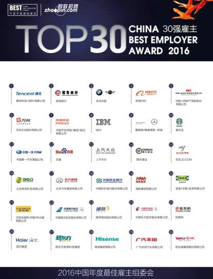 据智联招聘方面介绍,“中国年度最佳雇主”评选是由智联招聘联合北京大学社会调查研究中心共同发起的一项最佳雇主调查活动,已经持续11年。2016中国年度最佳雇主评选活动自2016年8月2日正式启动,从9740家报名企业中评选出了2016中国年度百强雇主,在9月13日至12月1日期间,根据雇主文化、雇主形象、组织管理、培训发展、薪酬福利、工作环境六大指标,针对百强雇主进行企业内部员工调查,最终,综合企业员工调查(60%)、专家评审(10%)、社会公众调查(20%)、企业人力资源管理问卷(10%)四个维度的打分产生了中国年度最佳雇主30强榜单。