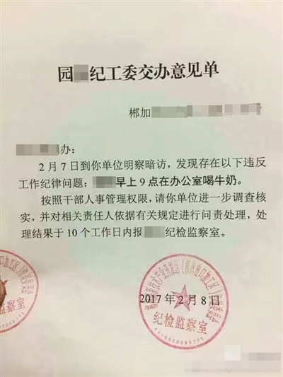 近日,湖南郴州高新技术产业开发区管委会纪检监察室开出一份问责意见单,通报一名员工早上9点在办公室喝牛奶。郴州高新区党工委委员、纪工委书记黄志中跟记者确认了这个消息,称相关单位只对其进行了口头的批评教育。但他也表示“喝牛奶”措辞不严谨,让大家的理解出现偏差。