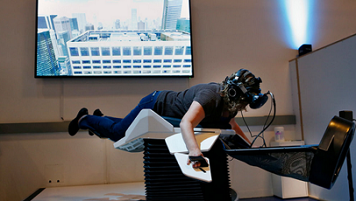 使用一个全身的虚拟现实设备就像蜷缩在展览的另一个角落是一种别无其他的体验。比如,模拟像鸟一样的滑翔体验,游客可以将自己绑在一个面向下的鸟座上,掀起翅膀,飞越曼哈顿或瑞士阿尔卑斯山。还有,流淌冷气的风扇使体验变得无比真实。