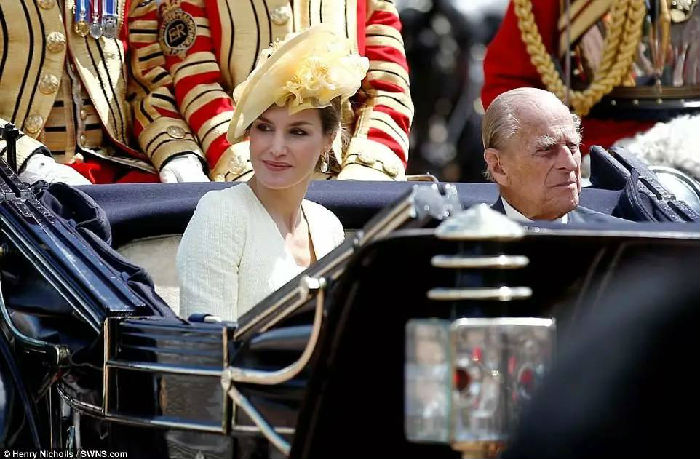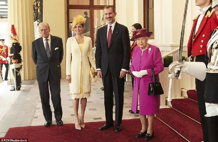 最左边是英国菲利普亲王,左二是西班牙王后Letizia Ortiz,左三是西班牙国王,最右边是英国女王。