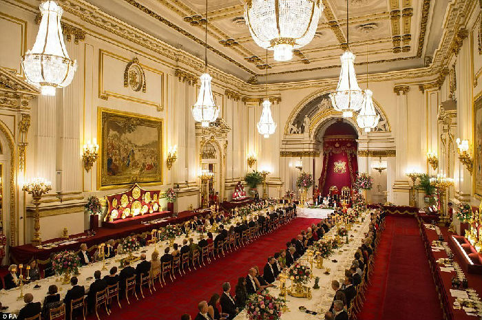 除了隆重的接待礼,还准备了盛大的宴会。查尔斯王子和卡米拉,威廉王子夫妇和哈里王子,也都来参加了。