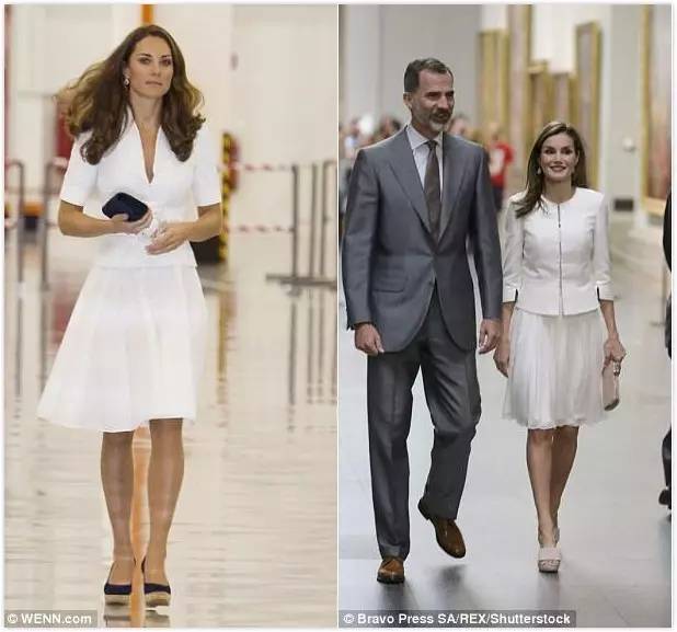 凯特的黑色手包和高跟鞋,则为整体的白色套装增色不少。而Letizia Ortiz上面白色夹克衫,搭配同色系纱裙,看起来既少女、有干练。
