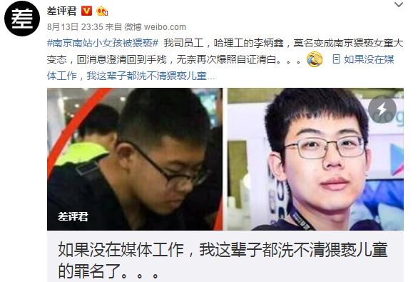 而不久之后,某微博大V转发了一则微博,称已发现涉事男子,其是「差评君」里的员工——哈理工毕业的李炳鑫。于是,网友们群起激昂,纷纷将矛头对准了李炳鑫。然而事实证明,这件事从头到尾,就是一场闹剧。就因为两者长相相似,李炳鑫便莫名被误认为是那个猥亵女童的男子。