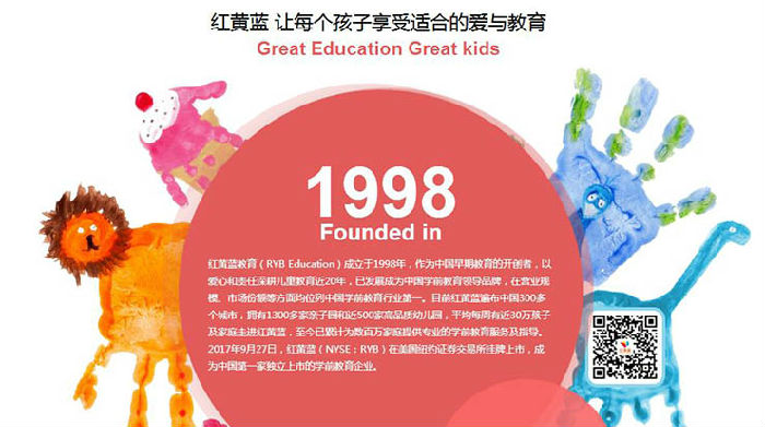 此次事件的主角——红黄蓝教育机构,并不是一个名不见经传的小机构。事实上,它几乎遍布全国各地。正如其官网上写的,“目前红黄蓝遍布中国300多个城市,拥有1300多家亲子园和近500家高品质幼儿园,平均每周有近30万孩子及家庭走进红黄蓝。”就在2017年9月27日,红黄蓝(NYSE:RYB)还在美国纽约证券交易所挂牌上市,成为中国第一家独立上市的学前教育企业。