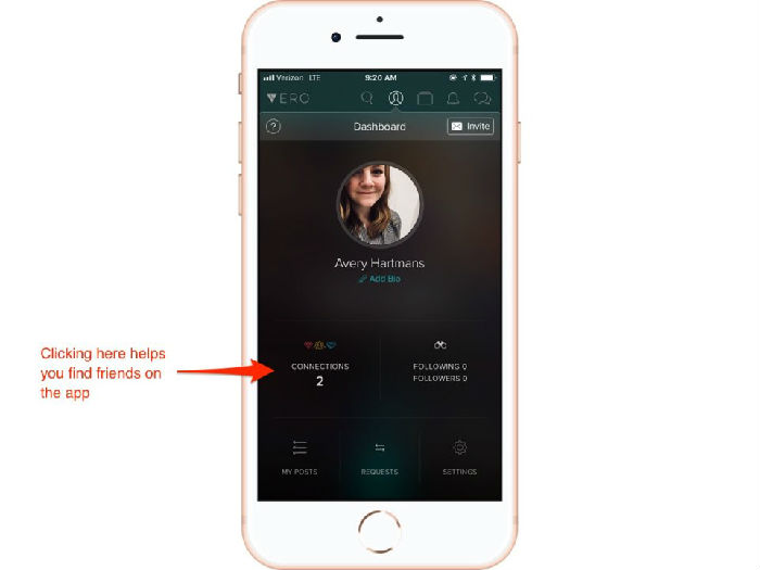 Vero的仪表板选项卡让你查看、更改个人信息。你可以添加一个头像、写一段简介,然后查看你的连接。
