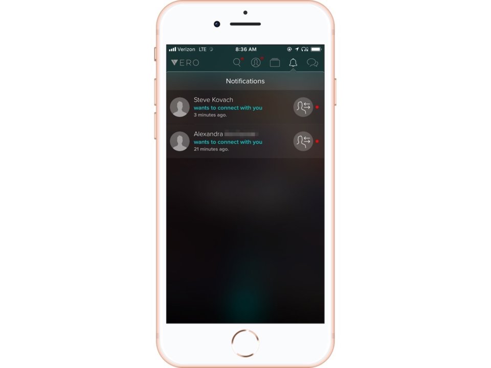 该图标的左侧是通知选项卡。如果有人在Vero加了你,就会在这显示出来。