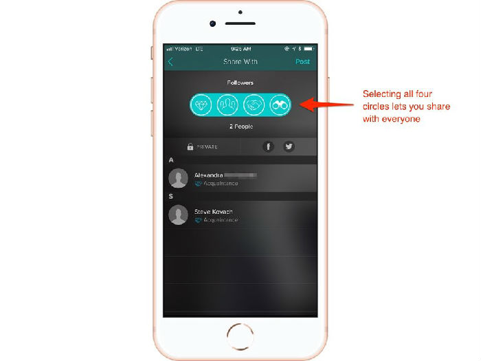Vero说,只有你可以看到连接是如何分类的,并把这些分类称为“循环”。当你想要与特定的人群共享一个帖子时,这个排序功能就派上了用场。