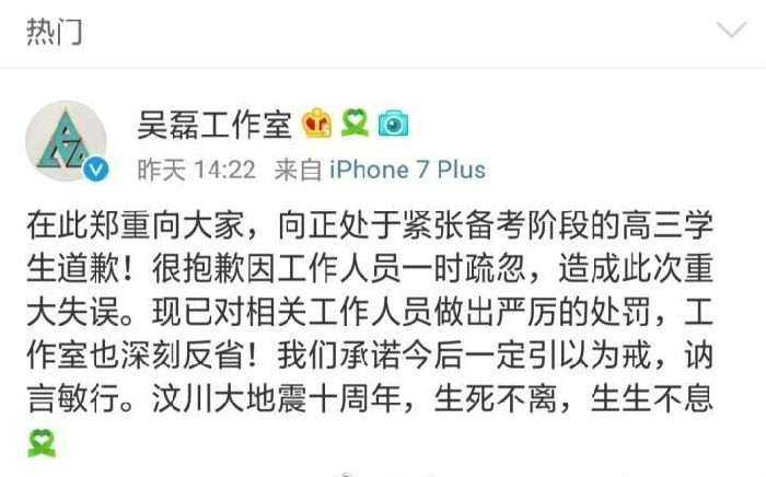 过后,吴磊工作室出来道歉,称吴磊目前在进行紧张的高三备考工作,该微博目前是由工作室的工作人员打理的,相关工作人员已经被严厉处罚,并承诺今后一定引以为戒,讷言敏行。