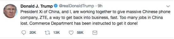 (特朗普13日发推文表示,他将与习主席就恢复中兴通讯业务一事展开合作以应对中兴工作岗位流失的情况。这与他先前指责中国窃取美国工作的态度可谓是两个极端。)