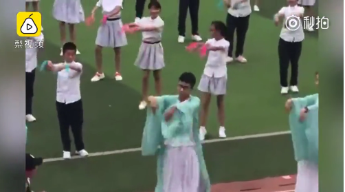 趋势网(微博|微信)讯:仙气飘飘,近日,湖北咸宁实验外国语学校以一名初一男生穿着汉服领跳海草舞,动作表情超有张力,让人忍俊不禁,学校老师也被他圈粉!男生说,他听到音乐就会嗨起来,这次跳舞收获好评还挺高兴的。