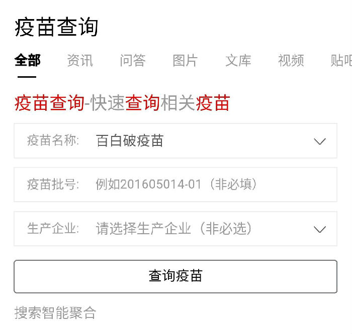 打开手机百度、移动网页版百度搜索或简单搜索APP,输入关键词“疫苗查询”即可进入查询页面。用户只需输入疫苗名称、疫苗批号(选填)及生产企业(选填)即可查询疫苗生产厂家、有效期等详细信息。