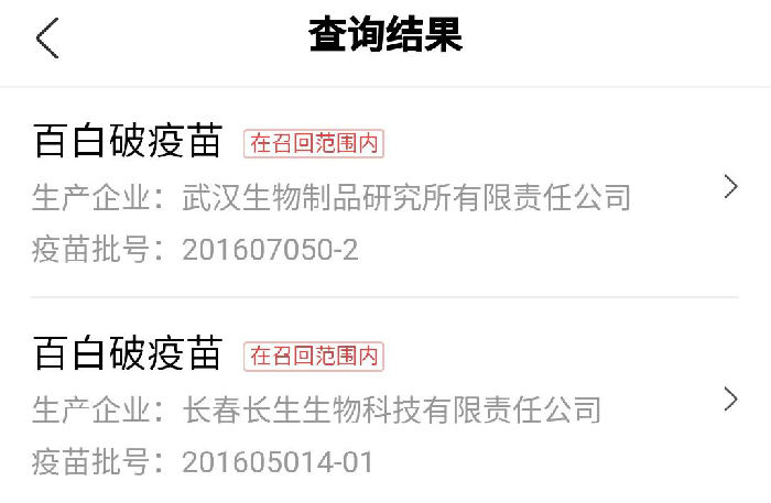 如果是问题疫苗,查询结果处就会显示“在召回范围内”的标签。如武汉生物和长春长生科技的这两个批号疫苗就被打上了召回的标签。
