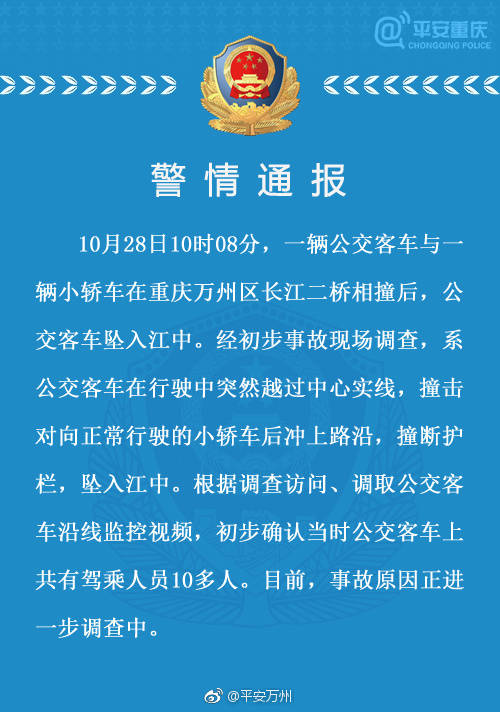 在10月28日17点46分,重庆市公安局万州分局通过官方微博,通报事故初步调查结果,万州警方称:10月28日10时08分,一辆公交客车与一辆小轿车在重庆万州区长江二桥相撞后,公交客车坠入江中。经初步事故现场调查,系公交客车在行驶中突然越过中心实线,撞击对向正常行驶的小轿车后冲上路沿,撞断护栏,坠入江中。根据调查访问、调取公交客车沿线监控视频,初步确认当时公交客车上共有驾乘人员10多人。目前,事故原因正进一步调查中。