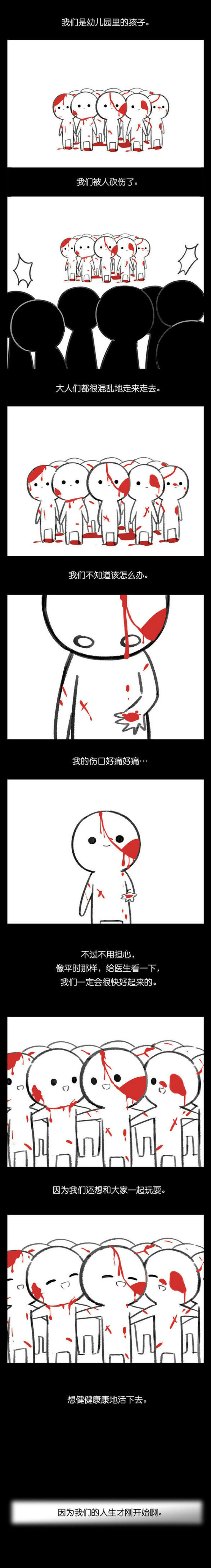 看到现场的一些照片和视频,有的孩子被砍到身染鲜血,有的孩子被砍到皮破血流不止,但是他们却不哭不闹的,只是面无表情,眼神空洞地站在那里,等待着医护人员的治疗。也许对他们来说,这一切都来得太突然,他们也许不知道经历了什么,但是他们没有选择权地默默承受了这一切,承受这位泄愤者的攻击,承受身体被砍伤的疼痛,承受这血淋淋的惨剧现场,承受精神收到的伤害和心理上的恐惧,承受这个年纪这个小身板不应该承受的经历。一切,都被安排得明明白白!
