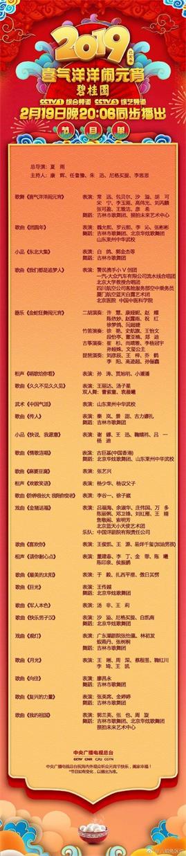 中央广播电视总台《2019年元宵晚会》总导演是夏雨,主持人有康辉、任鲁豫、朱迅、尼格买提和李思思。开场舞由包贝尔、沙溢和胡可等人表演歌舞《喜气洋洋闹元宵》,主要嘉宾有目前比较火的影视演员罗云熙、张彬彬、李沁、秦岚、古力娜扎和景甜等,还有古巨基、张艺兴、王俊凯、王源、易烊千玺、谢娜、王迅、鞠婧祎和杨迪等明星。