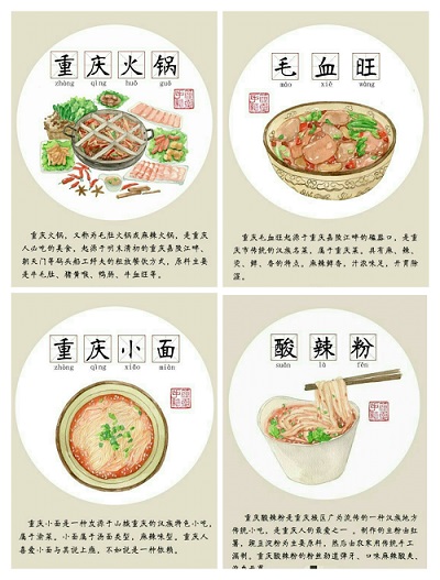 推荐:重庆火锅、毛血旺、重庆小面、酸辣粉、老麻抄手、水煮鱼、炸酥肉、蹄花汤、豌杂面、棒棒鸡、麻圆、山城小汤圆、熨斗糕、油醪糟、万州烤鱼、陈麻花、鸡汁锅贴、凉糕、鸡丝豆腐脑、酱香饼、羊角豆干、鸡丝凉面······