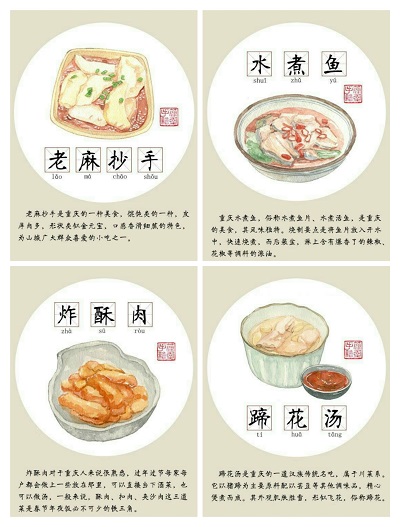 推荐:成都火锅、麻婆豆腐、钵钵鸡、脆皮火烧、夫妻肺片、五香卤排骨、串串香、担担面、肥肠粉、二姐兔丁、糖油果子、龙抄手、三大炮、奶油汤、冒菜、钟水饺、甜水面······