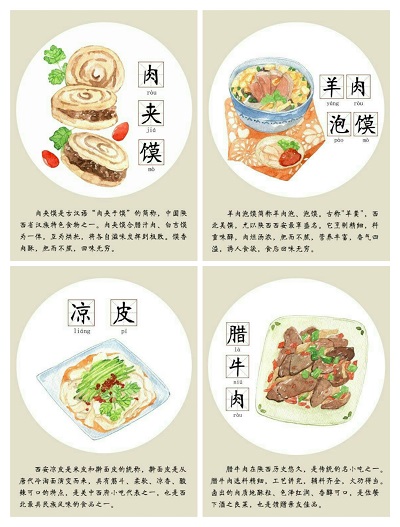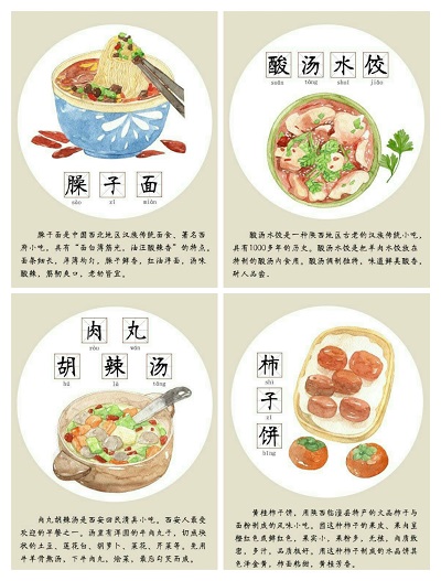 推荐:肉夹馍、羊肉泡馍、凉皮、腊牛肉、臊子面、酸汤水饺、胡辣汤、柿子饼、羊肉灌汤包、biangbiang面、油泼面、马虎面、菠菜面、裤带面、小酥肉、酸梅汤、粉蒸牛羊肉、葫芦头、甄糕、烤油馍、辣子疙瘩、水盆羊肉、油泼辣子······