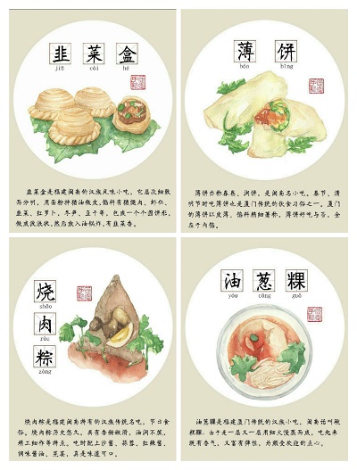 推荐:韭菜盒、薄饼、烧肉粽、油葱粿、沙茶面、花生汤、土笋冻、厦门馅饼、炸五香、鱼丸汤、面线糊、蚵仔煎、烧仙草、姜母鸭、芋包、闽南肠粉······