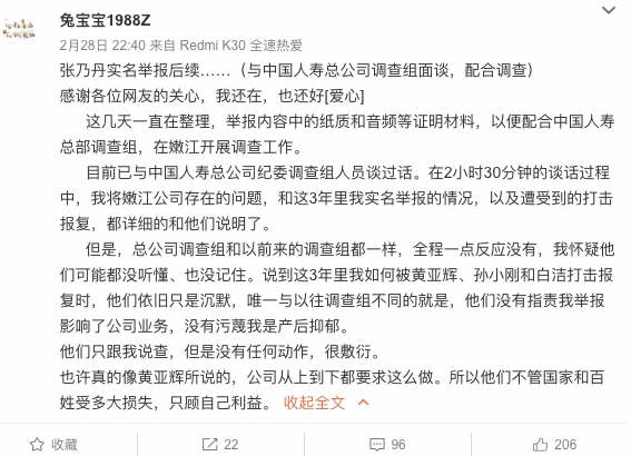 3月1日,中国人寿大量造假案举报人张乃丹再次发声,她表示,目前已与中国人寿总公司纪委调查组人员谈过话。但是,总公司调查组和以前来的调查组都一样,全程一点反应没有,他们只跟自己说查,但是没有任何动作,很敷衍。