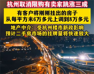 二级市场方面,受全面放开限购消息刺激,当日杭州本地上市房企滨江集团、绿城中国等纷纷大涨,其中广宇集团、南都物业以涨停价收盘。