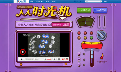 据了解,“人人时光机”是国内社交网站人人网在今年七夕推出的线上趣味活动。网友只需在浏览器中输入qixi.renren.com便可进入活动页面,然后根据提示选择一名人人好友便可共同“开启时光机,穿梭于过去与现在”。时光机开启后,人人网会通过一段诙谐幽默的Flash将你们的相遇时间(加好友的时间)、第一句留言、互相送过多少虚拟礼物等“回忆“信息一一呈现,然后根据这些信息计算出你们的幸福指数,得出结果后用户可以把这些信息做成卡片分享到人人网。